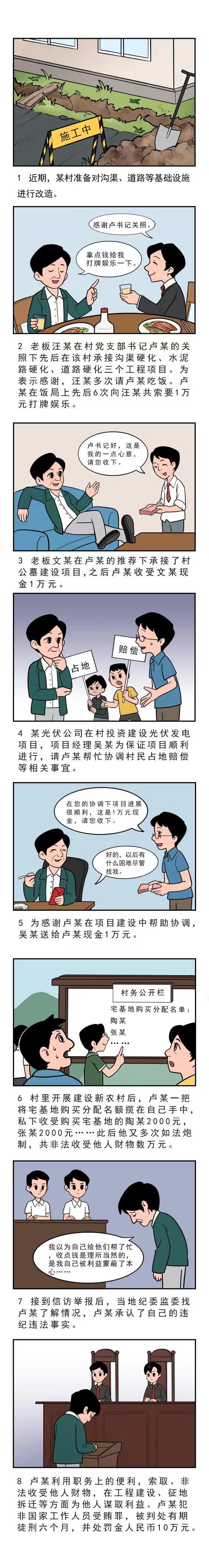 盧某,中共黨員,某村原黨支部書(shū)記、村主任。2006年至2017年,汪某在盧某的關(guān)照下先后在該村承接溝渠硬化、水泥路硬化、道路硬化三個(gè)工程項(xiàng)目。為表示感謝,汪某多次請(qǐng)盧某吃飯。盧某在飯局上先后6次向汪某共索要1萬(wàn)元打牌娛樂(lè)。2013年,文某在盧某的推薦下承接了村公墓建設(shè)項(xiàng)目,之后盧某收受文某所送現(xiàn)金1萬(wàn)元。2017年,某光伏公司在村投資建設(shè)光伏發(fā)電項(xiàng)目,項(xiàng)目經(jīng)理吳某為保證項(xiàng)目順利進(jìn)行,請(qǐng)盧某幫忙協(xié)調(diào)村民占地賠償?shù)认嚓P(guān)事宜,后項(xiàng)目在盧某的協(xié)調(diào)下順利進(jìn)行。2018年年初,為感謝盧某在項(xiàng)目建設(shè)中幫助協(xié)調(diào),吳某在項(xiàng)目指揮部辦公室送給盧某現(xiàn)金1萬(wàn)元。