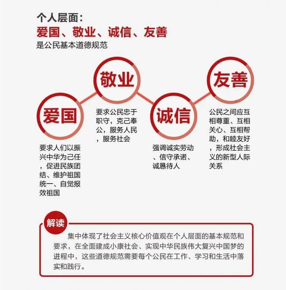 愛(ài)國(guó)、敬業(yè)、誠(chéng)信、友善體現(xiàn)了社會(huì)主義核心價(jià)值觀在道德準(zhǔn)則上的規(guī)定,是立足公民個(gè)人層面提出的要求,體現(xiàn)了社會(huì)主義價(jià)值追求和公民道德行為的本質(zhì)屬性。